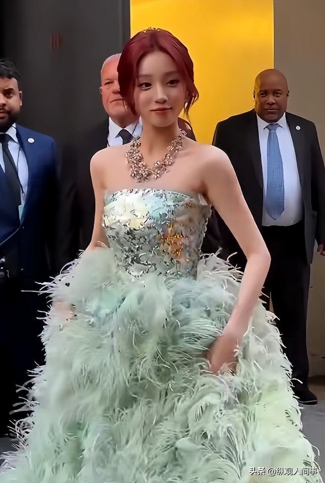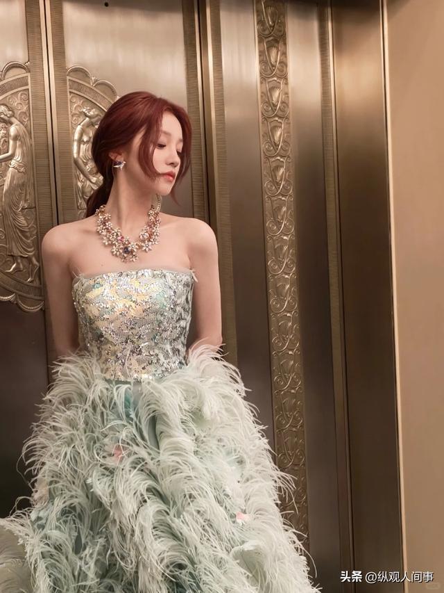 她一头红棕色长发随性散落,搭配薄荷绿亮片羽毛高定礼服,在满场黑白礼服中格外抢眼。