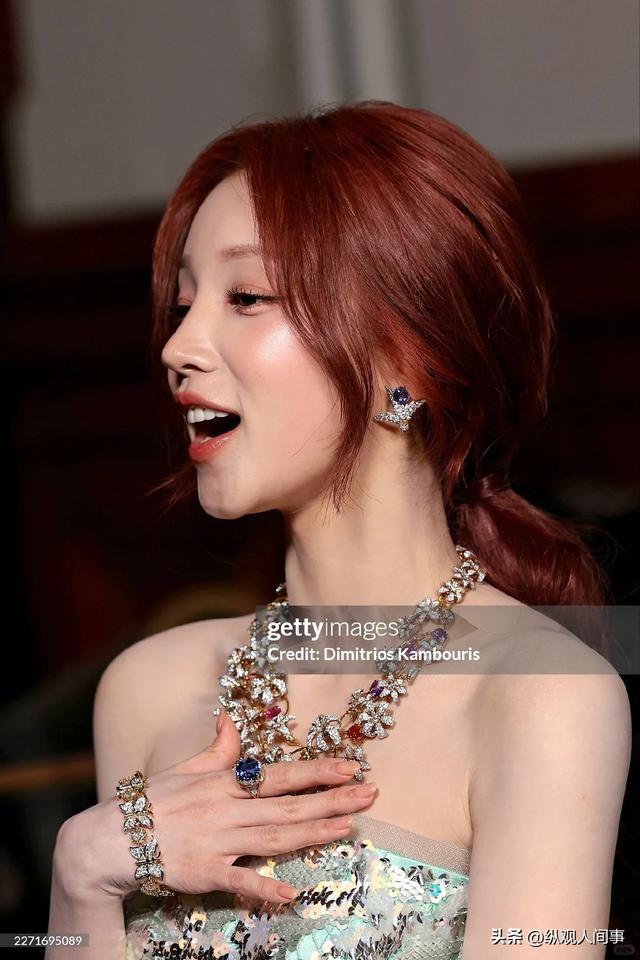 她佩戴的钻石藤蔓配红宝石项链,完美呼应“花语秘境”主题,举手投足间自带疏离的高级感。