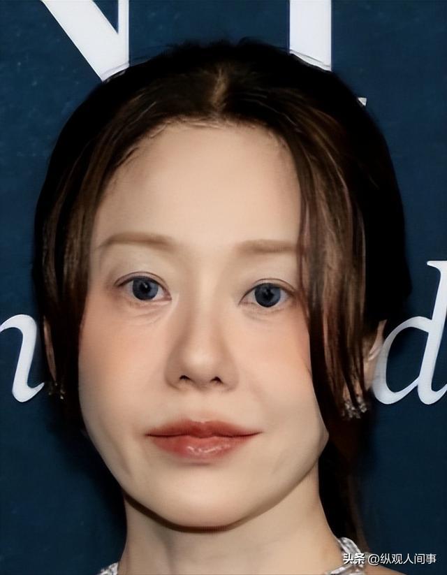 无滤镜生图下,高贤贞面部松弛明显,眼角皱纹很深,苹果肌下垂、法令纹突出,整张脸看起来有些僵硬,明显有医美痕迹。