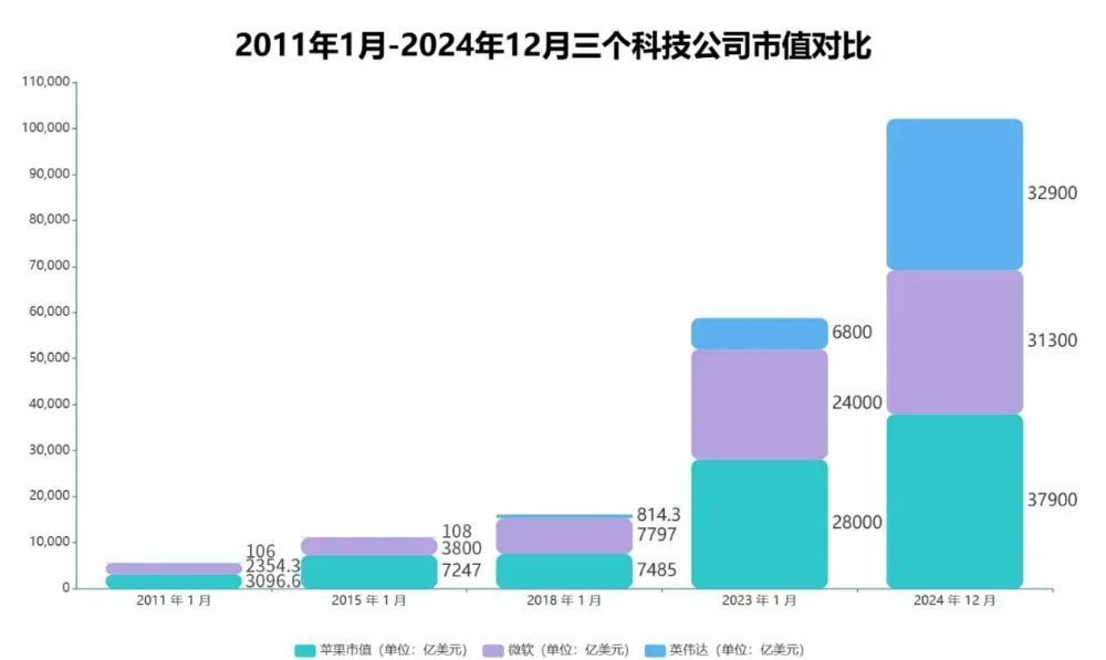 2011年1月-2024年12月三个科技公司市值对比