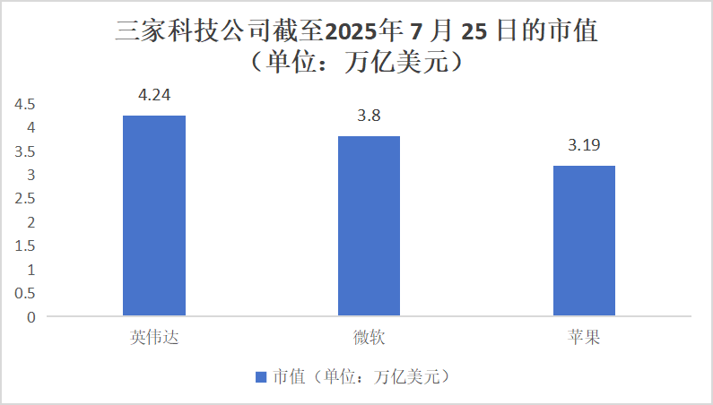 截至7月25日,英伟达的市值为4.24万亿美元,微软的市值为3.8万亿美元,苹果的市值为3.19万亿美元。